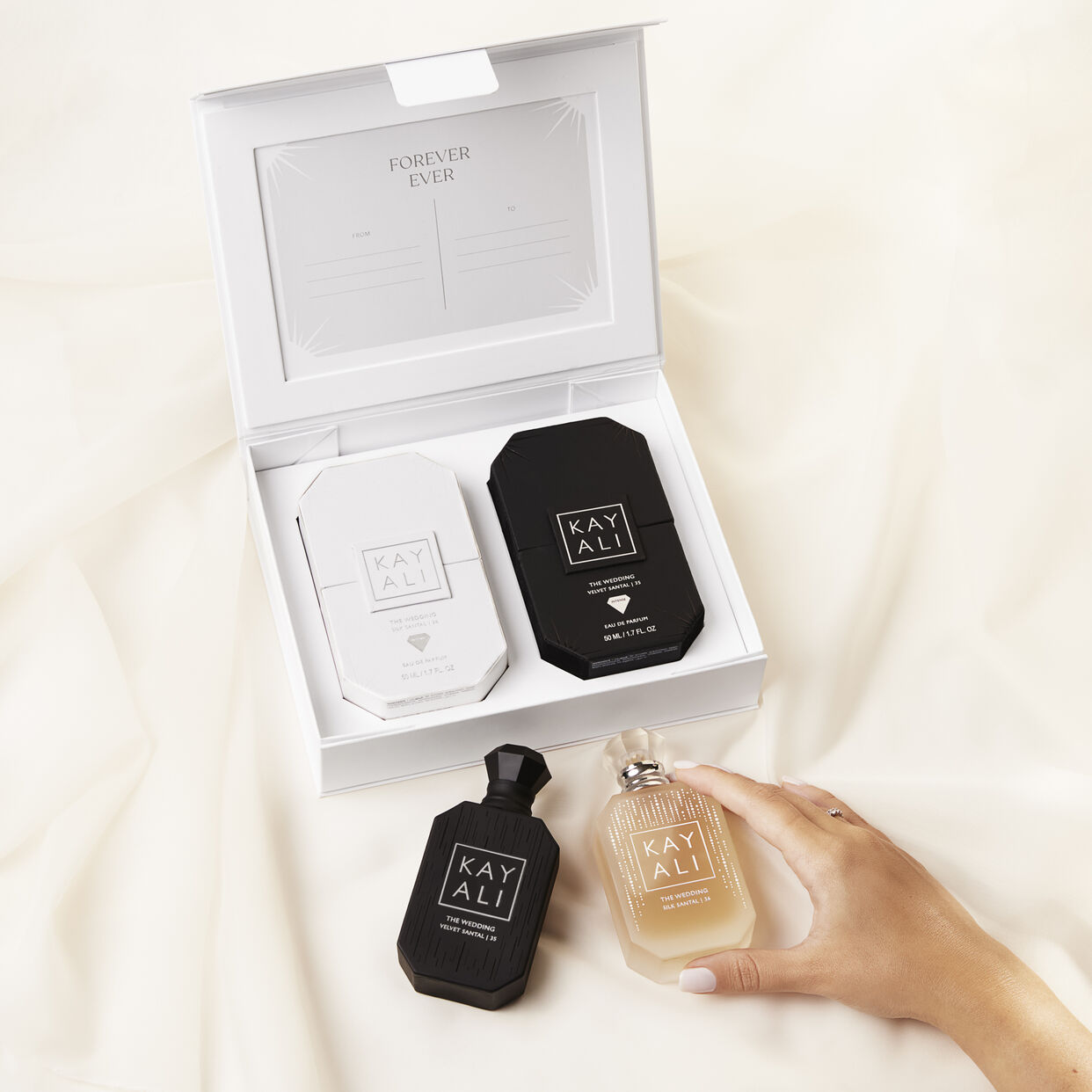 Forever ever ... Introducing The Wedding Duo, a fragrant tribute to Mona and Hassan’s love story, featuring The Wedding Velvet Santal | 35 and The Wedding Silk Santal | 36. These juices are bound by the strength of creamy sandalwood. Also known as Santal, this hero note grounds each scent while also glorifying the unique blend of decadent ingredients found in each bottle. Timeless when worn alone yet amplified when layered together, these juices are made to be shared and celebrate love in all its forms.